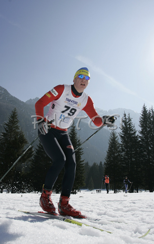 : Gregor Kralj of Slovenia skiing in Men 10+10km pursuit race of Junior Nordic skiing World Championships in Tarvisio, Italy. Men 10+10km pursuit race of Junior Nordic skiing World Championships in Tarvisio, Italy was held on 16th of March 2007 in Fusine, Italy. Due warm weather and lack of snow, cross country skiing races of Junior Nordic skiing World Championships 2007 were moved from Tarvisio, Italy to Fusine, Italy.