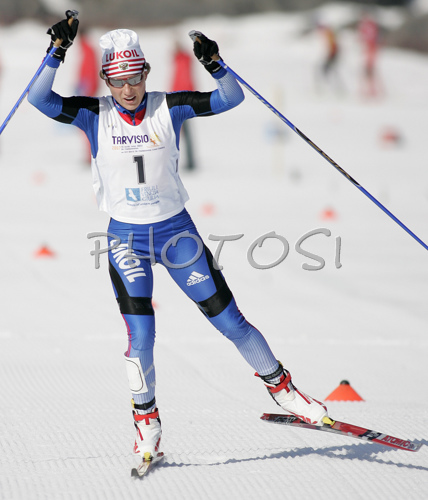 : Winner Ioulia Tchekaleva of Russia celebrating her victory when crossing finish line in Women 7.5+7.5km pursuit race of Under23 Nordic skiing World Championships in Tarvisio, Italy. Women 7.5+7.5km pursuit race of Junior Nordic skiing World Championships in Tarvisio, Italy was held on 17th of March 2007 in Fusine, Italy. Due warm weather and lack of snow, cross country skiing races of Junior Nordic skiing World Championships 2007 were moved from Tarvisio, Italy to Fusine, Italy.