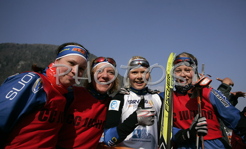 Tarvisio ,Italy - 18.03.2007 : Girls of Finnish relay, Satu Annila, Kerttu Niskanen, Anne Kyllonen and Mari Laukkanen celebrating their bronze medal won in Women 4x3.3km relay race of Junior Nordic skiing World Championships in Tarvisio, Italy. Women 4x3.3km relay race of Junior Nordic skiing World Championships in Tarvisio, Italy was held on 18th of March 2007 in Fusine, Italy. Due warm weather and lack of snow, cross country skiing races of Junior Nordic skiing World Championships 2007 were moved from Tarvisio, Italy to Fusine, Italy. Photo by: Primoz Jeroncic/PhotoSI