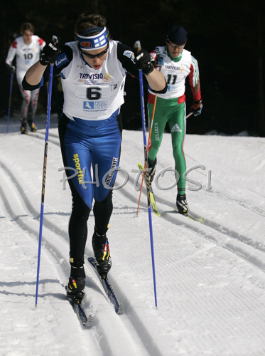 : Martti Jylhae of Finland skiing in Men 4x5km relay race of Junior Nordic skiing World Championships in Tarvisio, Italy. Men 4x5km relay race of Junior Nordic skiing World Championships in Tarvisio, Italy was held on 18th of March 2007 in Fusine, Italy. Due warm weather and lack of snow, cross country skiing races of Junior Nordic skiing World Championships 2007 were moved from Tarvisio, Italy to Fusine, Italy.
