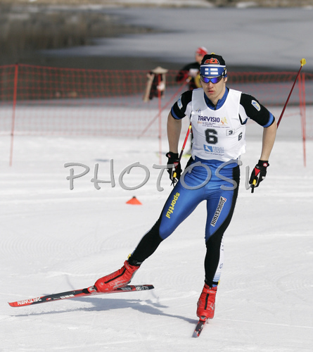: Heikki Kopakka of Finland skiing in Men 4x5km relay race of Junior Nordic skiing World Championships in Tarvisio, Italy. Men 4x5km relay race of Junior Nordic skiing World Championships in Tarvisio, Italy was held on 18th of March 2007 in Fusine, Italy. Due warm weather and lack of snow, cross country skiing races of Junior Nordic skiing World Championships 2007 were moved from Tarvisio, Italy to Fusine, Italy.