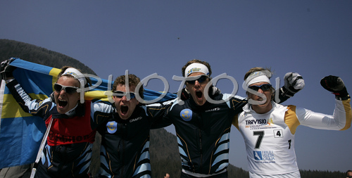 : Team of Sweden, Jesper Modin, Patrik Karlsson, Magnus Engstrom and Adam Johansson celebrating their victory in Men 4x5km relay race of Junior Nordic skiing World Championships in Tarvisio, Italy. Men 4x5km relay race of Junior Nordic skiing World Championships in Tarvisio, Italy was held on 18th of March 2007 in Fusine, Italy. Due warm weather and lack of snow, cross country skiing races of Junior Nordic skiing World Championships 2007 were moved from Tarvisio, Italy to Fusine, Italy.