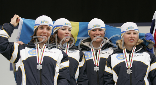 : Second placed team of Sweden with Mia Eriksson, Eve Svensson, Anna Simberg and Charlotte Kalla celebrating their medals won in Women 4x3.3km relay race of Junior Nordic skiing World Championships in Tarvisio, Italy. Women 4x3.3km relay race of Junior Nordic skiing World Championships in Tarvisio, Italy was held on 18th of March 2007 in Fusine, Italy. Due warm weather and lack of snow, cross country skiing races of Junior Nordic skiing World Championships 2007 were moved from Tarvisio, Italy to Fusine, Italy.