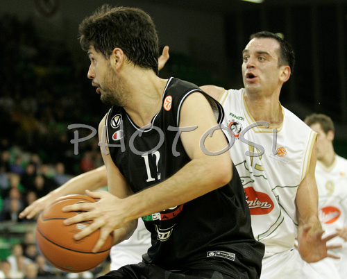 : Giovannoni Guilherme (no.12) of Virtus Vidivici (L) and Jasmin Hukic (no.13) of Union Olimpija (R) during match of 13th round of Basketball Euroleague 2007-08. Match between Union Olimpija, Ljubljana, Slovenia, and Virtus VidiVici, Bologna, Italy was played on 24th of January 2008 in Tivoli Arena in Ljubljana, Slovenia. Match was won by Union Olimpija, who defeated Virtus VidiVici with 75:60.