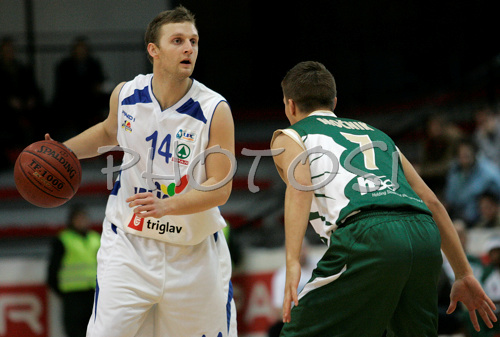 : Jure Mocnik (no.14) of Helios Domzale (L) and Jan Mocnik (no.7) of Union Olimpija (R) during final match of Spar Cup 2007-08 between Union Olimpija, Ljubljana, Slovenia, and Helios Domzale, Slovenia. Match between Union Olimpija and Helios Domzale was played on 10th of February 2008 in Arena Kodeljevo in Ljubljana, Slovenia. Match and Cup was won by Union Olimpija, who defeated Helios Domzale in final match with 85:66.