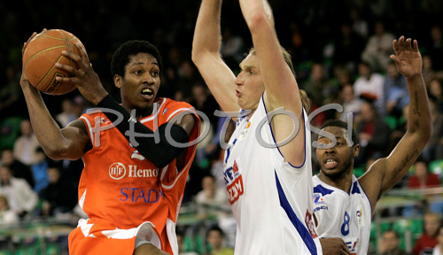 Ljubljana ,Slovenia - 25.04.2008 : Rawle Marshall (no.23) of KK Hemofarm Stada (L) and Todor Gecevski (no.11) of KK Zadar (R) during first half finals match of Basketball NLB League final four between KK Zadar, Croatia and Hemofarm Stada, Vrsac, Serbia. Match between KK Zadar and Hemofarm Stada was played on 25th of April 2008 in Tivoli Arena in Ljubljana, Slovenia. Match was won by Hemofarm Stada, who defeated KK Zadar with 81:72. Photo by: Primoz Jeroncic
