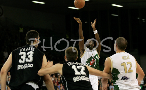 : Cristopher Booker (no.6) of Union Olimpija (M) shooting over Slavko Vranes (no.33) of KK Partizan Igokea (L), Novica Velickovic (no.12) of KK Partizan Igokea (2nd from L) and Marko Milic (no.12) of Union Olimpija (R) during second half finals match of Basketball NLB League final four between Union Olimpija, Ljubljana, Slovenia and Partizan Beograd, Serbia. Match between Union Olimpija and Partizan Begrad was played on 25th of April 2008 in Tivoli Arena in Ljubljana, Slovenia. Match was won by Partizan, who defeated Union Olimpija with 94:90.