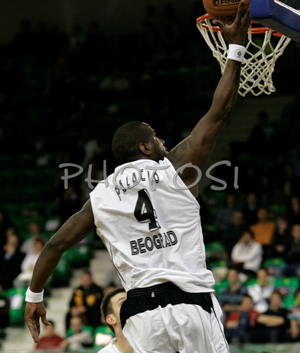 : Milton Palacio (no.4) of KK Partizan Igokea scoring during finals match of Basketball NLB League final four between Partizan Beograd, Serbia and Hemofarm Stada, Vrsac, Serbia. Match between Hemofarm Stada and Partizan Begrad was played on 26th of April 2008 in Tivoli Arena in Ljubljana, Slovenia. Match was won by Partizan, who defeated Hemofarm with 69:51.
