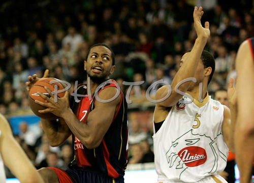 : Mustafa Shakur (no.22) of Tau Ceramica (L) attacking next to Jonathan Wallace (no.5) of Union Olimpija (R) during match of Basketball Euroleague between Union Olimpija, Ljubljana, Slovenia and Tau Ceramica, Vitoria, Spain. Match between Union Olimpija and Tau Ceramica was played on 30th of October 2008 in Tivoli Arena in Ljubljana, Slovenia.