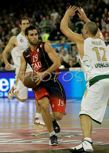 : Fernando San Emeterio (no.19) of Tau Ceramica (L) and Marko Milic (no.12) of Union Olimpija (R) during match of Basketball Euroleague between Union Olimpija, Ljubljana, Slovenia and Tau Ceramica, Vitoria, Spain. Match between Union Olimpija and Tau Ceramica was played on 30th of October 2008 in Tivoli Arena in Ljubljana, Slovenia.