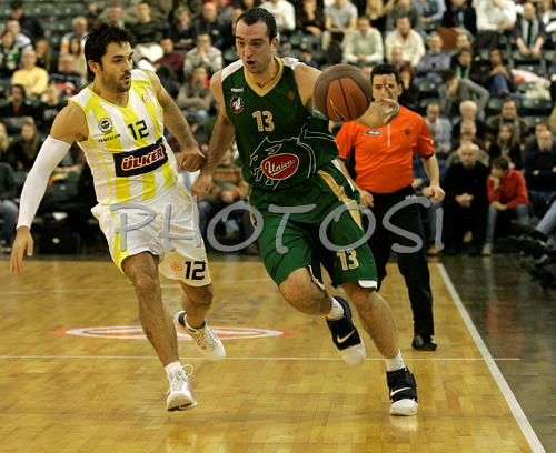 : Jasmin Hukic (no.13) of Union Olimpija (R) and Damir Kaan Mrsic (no.12) of Fenerbahce Ulker (L) during match of Basketball Euroleague between Union Olimpija, Ljubljana, Slovenia and Fenerbahce Ulker, Turkey. Match between Union Olimpija and Fenerbahce Ulker was played on 8th of January 2009 in Tivoli Arena in Ljubljana, Slovenia.