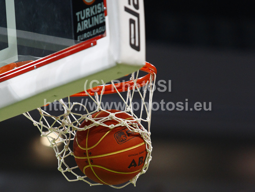 : Basketball ball going through the net during match of NLB Adriatic basketball League between Union Olimpija and Partizan. Match of NLB Adriatic basketball League between Union Olimpija, Ljubljana, Slovenia and Partizan, Belgrade, Serbia was played in Stozice Arena, Ljubljana, Slovenia, on Sunday, 31st of October 2010.