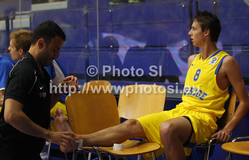 : Marcus Eriksson of Sweden is being treated by physiotherapist of Swedish team, Karandish Emad, during FIBA U-20 European Championships match between Slovenia and Sweden. Match between Slovenia and Sweden of FIBA U-20 European basketball Championships was played on Friday, 13th of July 2012 in Domzale, Slovenia.