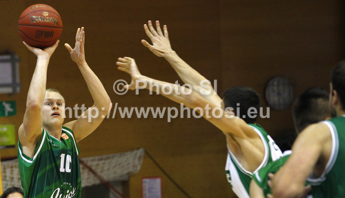 : Sasu Salin (no.10) of Union Olimpija shooting during Slovenia Super cup basketball match between last years Slovenia Cup champions team, KK Union Olimpija and Slovenia national championships winning team KK Krka-Telekom. Match between Union Olimpija, Ljubljana, and KK Krka-Telekom, Novo Mesto, was played in in Grosuplje, Slovenia, on Tuesday, 25th of September 2012.