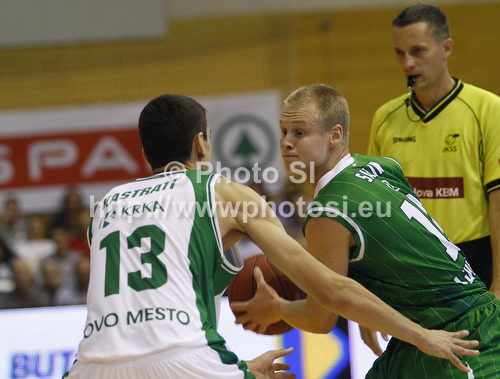 : Sasu Salin (no.10) of Union Olimpija (R) and Erjon Kastrati (no.13) of KK Krka-Telekom (L) during Slovenia Super cup basketball match between last years Slovenia Cup champions team, KK Union Olimpija and Slovenia national championships winning team KK Krka-Telekom. Match between Union Olimpija, Ljubljana, and KK Krka-Telekom, Novo Mesto, was played in in Grosuplje, Slovenia, on Tuesday, 25th of September 2012.