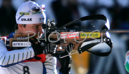 : Teja Gregorin of Slovenia shooting during women pursuit race on Pokljuka, Slovenia. IBU Biathlon World Cup sprint race was held on Pokljuka, Slovenia on 19th of January 2007.