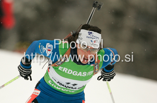 : Julie Carraz-Collin of France during women 15km individual race of e.on Ruhrgas IBU Biathlon World Cup 2009-10. Women individual race of e.on Ruhrgas IBU Biathlon World Cup was held in Pokljuka, Slovenia, on 17th of December 2009.