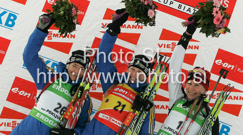 : Winner Helena Jonsson of Sweden (M), second placed Anna Carin Olofsson-Zidek of Sweden (L) and third placed Anastasiya Kuzmina of Slovakia (R) celebrating their medals won in women 15km individual race of e.on Ruhrgas IBU Biathlon World Cup 2009-10. Women individual race of e.on Ruhrgas IBU Biathlon World Cup was held in Pokljuka, Slovenia, on 17th of December 2009.