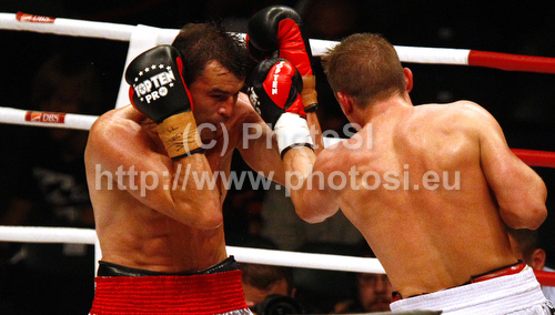 : Denis Simcic of Slovenia and Istvan Varga of Romunia during WBF International boxing match. WBF International boxing match between Simcic and Varga was held on 4th of September 2010 in Stozice Arena in Ljubljana, Slovenia.