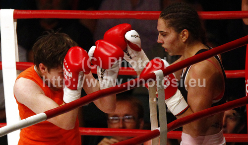 : Tjasa Kolar of Slovenia and Anika Kurzer of Germany during boxing match. Boxing match between Kolar and Kurzer was held on 4th of September 2010 in Stozice Arena in Ljubljana, Slovenia.