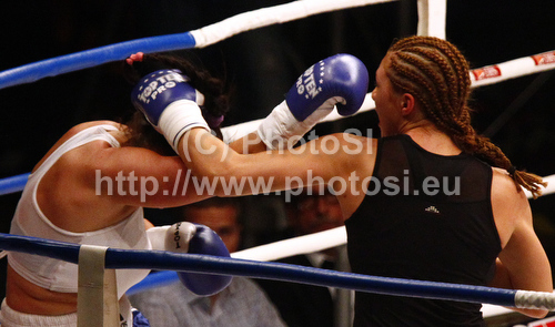 : Christina Hammer of Germany and Mihaela Dragan of Romania during boxing match. Boxing match between Hammer and Dragan was held on 4th of September 2010 in Stozice Arena in Ljubljana, Slovenia.