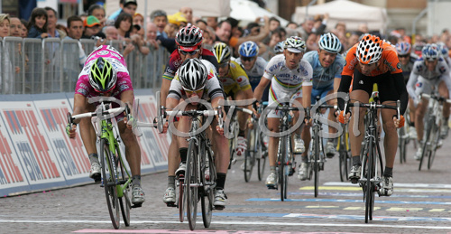 : Winner Daniele Bennati (Italy) of Liquigas (L), second placed Mark Cavendish (United Kingdom) of High Road (R) and third placed Robbie Mcewen (Australia) of Silence-Lotto (M) arriving to finish line in 12th stage of Giro d Italia, from Forli to Carpi (169 km). 12th stage was held on 22nd of May 2008.
