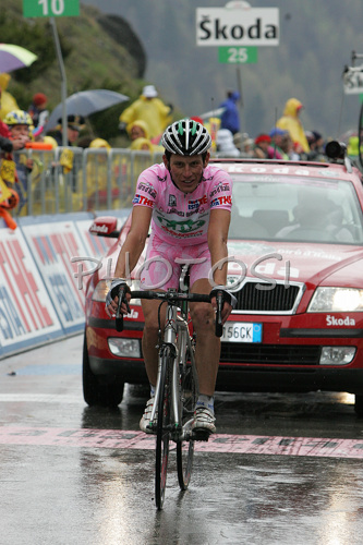 : 39th placed Gabriele Bosisio (Italy) of LPR Brakes (left) at finish line of 15th stage of Giro d Italia, from Arabba to Passo Fedaia / Marmolada - Dolomiti Stars (153 km). 15th stage was held on 25th of May 2008.