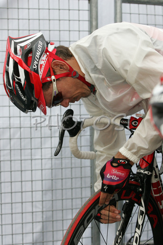 Prato Nevoso ,France - 20.07.2008 : Robbie McEwen (Aus, Silence-Lotto) is checking the pressure in the tyre at 15th stage from Embrun (FRA) to Prato Nevoso (ITA, 183 km) of Tour de France, 2008. The stage was held on 20th of July, 2008. Photo by: Mitja Smid Bricelj