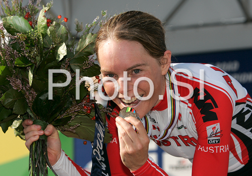 Varese ,Italy - 24.09.2008 : Second placed Christiane Soeder of Austria celebrating her medal won in Women elite time trial race of UCI Road Cycling World Championships in Varese, Italy. Women elite time trial of UCI Road cycling World Championships was held in Varese, Italy, on Wednesday 24th of September 2008. Photo by: Primoz Jeroncic