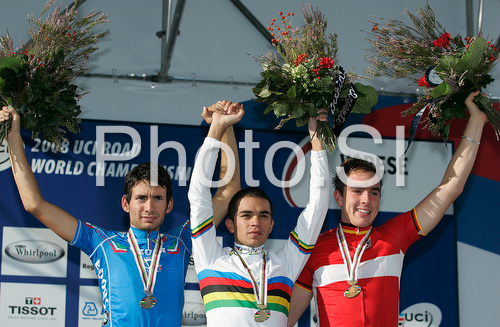 : Winner Fabio Andres Duarte Arevalo of Colombia (M), second placed Simone Ponzi of Italy (L) and third placed John Degenkolb of Germany (R) celebrate their medals won in Men U23 road race of UCI Road Cycling World Championships in Varese, Italy. Men U23 road race of UCI Road cycling World Championships was held in Varese, Italy, on Friday 26th of September 2008.