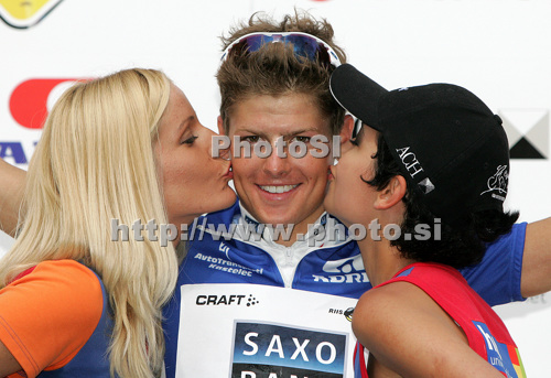 : Jakob Fuglsang of Denmark (Team Saxo Bank) in blue jersey as the best rider in points classification at the flower ceremony of the fourth stage of Tour de Slovenie 2009 from Sentjernej to Novo mesto. The fourth stage was 153 km long and it was held on Sunday, 21st of June, 2009.