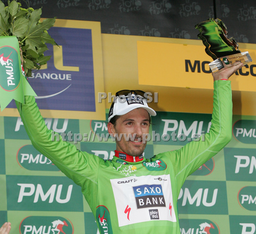 : Fabian Cancellara of Switzerland (Team Saxo Bank) in green jersey at the flower ceremony after the individual time trial in the first stage of Tour de France (15,5 km). The individual time trial was held on Saturday, 4th of july in Monaco.