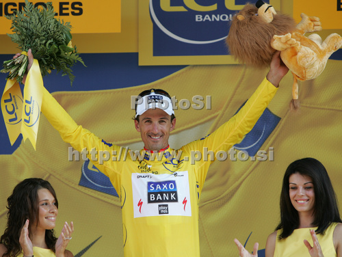 Brignoles ,France - 05.07.2009 : Fabian Cancellara of Switzerland (Team Saxo Bank)in yellow jersey as the best rider in general classification at the flower ceremony of the second stage of Tour de France from Monaco to Brignoles (187 km). The second stage was held on Sunday, 5th of July.