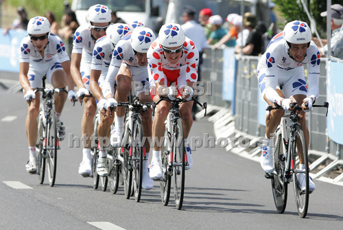 : Team Francaise des Jeux riding at the team time trial of the fourth stage of Tour de France from Montpellier to Montpellier (39 km). The fourth stage was held on Tuesday, 7th of July.