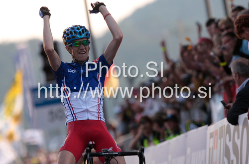 : Winner Romain Sicard of France celebrating his victory when crossing finish line of Men U23 UCI Road cycling World Championships road race in Mendrisio, Switzerland. 179.4km long Men U23 road race was held in Mendrisio, Switzerland, on 26th of September 2009.