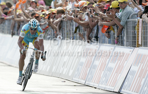 : Fifth placed Alexandre Vinokurov of Kazakhstan (Astana) finishing the 14th stage of Giro d Italia from Ferrara to Asolo. The stage was 205 km long. The 14th stage of Giro d Italia 2010 from Ferrara to Asolo was held on Saturday, 22nd of May 2010 in Italy.