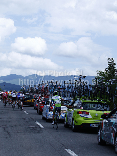: Riders are getting refreshments from team cars during first stage of Tour de Slovenie 2010. First stage of 17th Tour de Slovenie 2010 in length of 173km was leading cyclists from Koper, Slovenia, to Medvode, Slovenia. First stage was held on Thursday, 17th of June 2010.