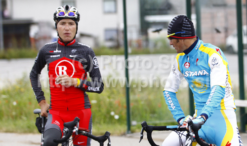 : Janez Brajkovic of Radioshack (L) and Gorazd Stangelj of Astana watching fourth and last stage of Tour de Slovenie 2010. Fourth stage of 17th Tour de Slovenie 2010 in length of 157km was leading cyclists from Brezice, Slovenia, to Novo Mesto, Slovenia. Fourth stage was held on Sunday, 20th of June 2010.