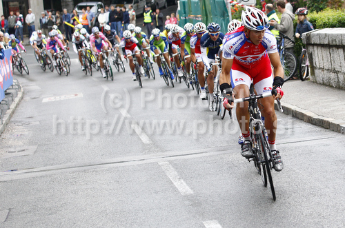 : Cyclist of Adria-Mobil leading peloton during fourh and last stage of Tour de Slovenie 2010. Fourth stage of 17th Tour de Slovenie 2010 in length of 157km was leading cyclists from Brezice, Slovenia, to Novo Mesto, Slovenia. Fourth stage was held on Sunday, 20th of June 2010.
