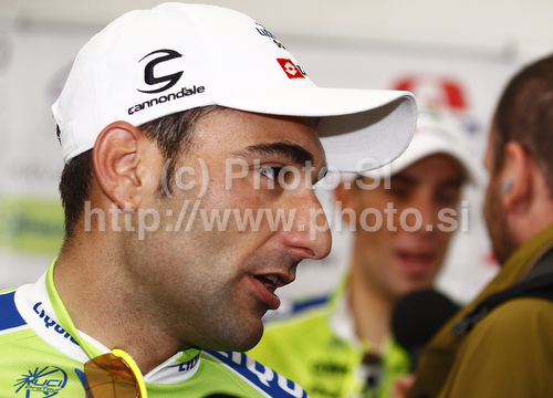 : Overall winner Vincenzo Nibali of Liquigas-Doimo (R) and winner of stage Francesco Chicchi of Liquigas-Doimo (L) being interviewed after fourh and last stage of Tour de Slovenie 2010. Fourth stage of 17th Tour de Slovenie 2010 in length of 157km was leading cyclists from Brezice, Slovenia, to Novo Mesto, Slovenia. Fourth stage was held on Sunday, 20th of June 2010.