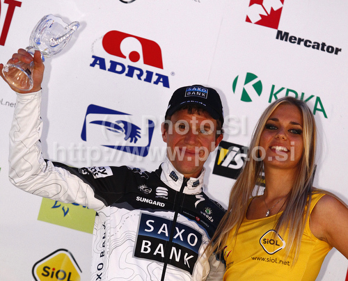 : Third placed Chris Anker Sorensen of Team Saxo Bank celebrating his medal after fourth and last stage of Tour de Slovenie 2010. Fourth stage of 17th Tour de Slovenie 2010 in length of 157km was leading cyclists from Brezice, Slovenia, to Novo Mesto, Slovenia. Fourth stage was held on Sunday, 20th of June 2010.