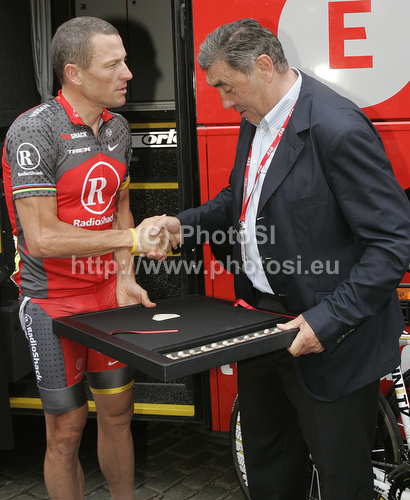 : Lance Armstrong of USA (Team Radioshack) got the special edition of the book from Eddie Merckx at the start of the second stage of the 97th Tour de France from Bruxelles to Spa (Belgium). The stage was 201 km long. The second stage of 97th of Tour de France 2010 from Bruxelles to Spa was held on Monday, 5th of July 2010 in Belgium.
