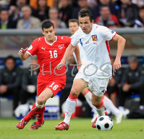 : Czech Republics midfielder Tomas Galasek, right, fights for the ball with Switzerlands midfielder Tranquillo Barnetta during the Euro 2008 Group A soccer match between Switzerland and Czech Republic at the St. Jakob Park (Joggeli) stadium in Basel, Switzerland, Saturday June 7, 2008.