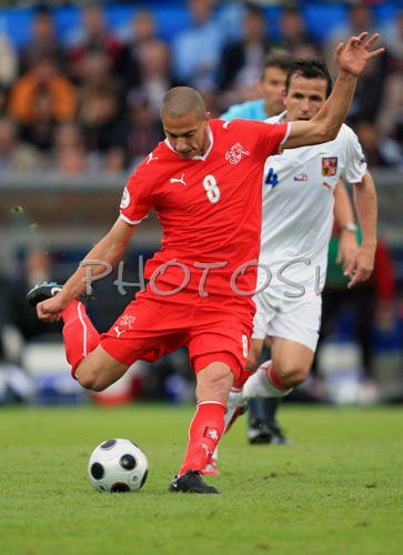 : Switzerlands midfielder Goekhan Inler kicks the ball during the Euro 2008 Group A soccer match between Switzerland and Czech Republic at the St. Jakob Park (Joggeli) stadium in Basel, Switzerland, Saturday June 7, 2008.