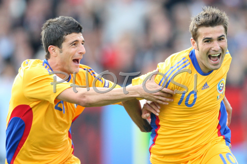 : Romanias forward Daniel Niculae, left, celebrates with Romanias forward Adrian Mutu after scoring against Italy during the Euro 2008 Group C soccer match between Italy and Romania at the Letzigrund stadium in Zurich, Switzerland, Friday June 13, 2008.