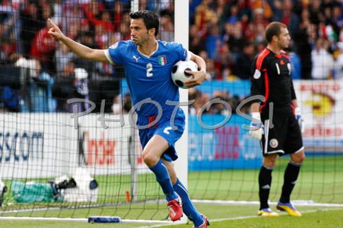 : Italys defender Christian Panucci, left, celebrates after scoring against Romania while Romanias goalkeeper Bogdan Lobont looks on during the Euro 2008 Group C soccer match between Italy and Romania at the Letzigrund stadium in Zurich, Switzerland, Friday June 13, 2008.