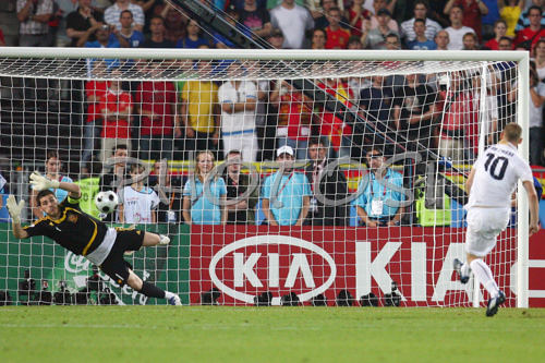 : Spains goalkeeper Iker Casillas holds the ball kicked by Italys midfielder Daniele De Rossi during the Euro 2008 quarter final soccer match between Spain and Italy at the Ernst Happel stadium in Vienna, Austria, Sunday June 22, 2008.