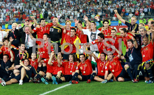 : Spainish team celebrating with trophy after the Euro 2008 final soccer match between Spain and Germany at the Ernst Happel stadium in Vienna, Austria, Sunday June 29, 2008.