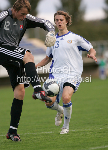 : Roope Riski of Finland (R) and goalie Pavol Bajza of Slovakia (L) during football match of U19 UEFA European Championships Qualification tournament between Slovakia and Finland. Match between Slovakia and Finland was played in Murska Sobota, Slovenia, on 11th of October 2009.