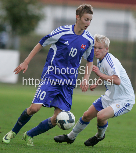 : Jan Gregus of Slovakia (L) and Patrick Poutiainen of Finland (R) during football match of U19 UEFA European Championships Qualification tournament between Slovakia and Finland. Match between Slovakia and Finland was played in Murska Sobota, Slovenia, on 11th of October 2009.